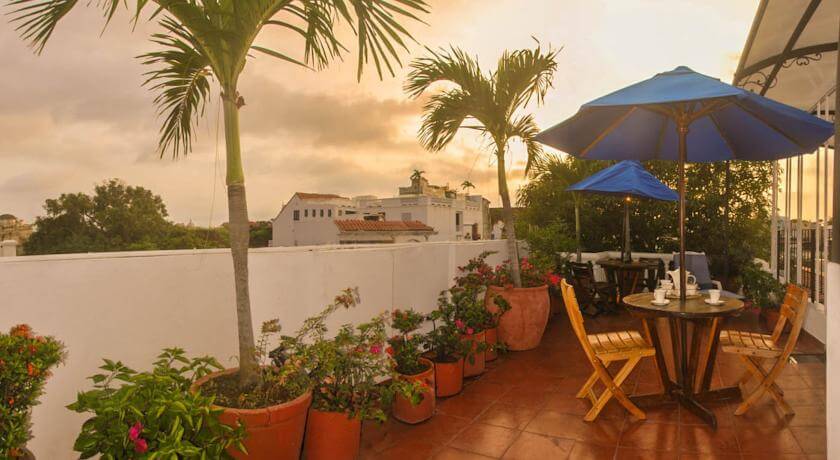 Patio interior, terraza en el piso superior con vista sobre la ciudad para tomar deliciosos desayunos; facilidades para ir al hotel 3 Banderas