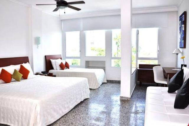 Dos jacuzzi con hidromasajes, terraza Televisor LCD de 32” con señal de cable (106 canales), Escritorio, Baño privado, Secador de cabello, Teléfono, Nevera, Closet, Cajilla de seguridad, Maletero, Aire acondicionado, Abanico e internet.